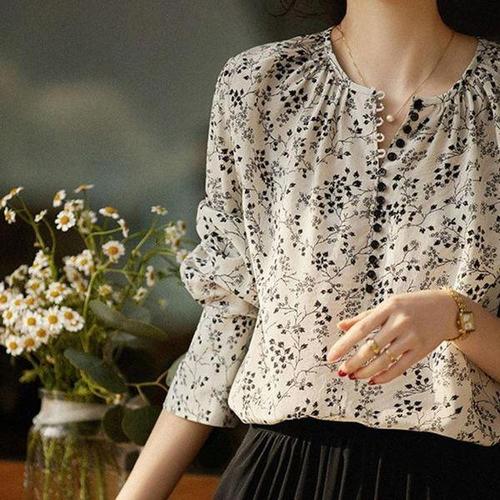 besteffie 봄 가을 중년여성 쉬폰 브이넥 루즈핏 플라워 잔꽃패턴 빅사이즈 엄마옷 롱 여자블라우스 C15