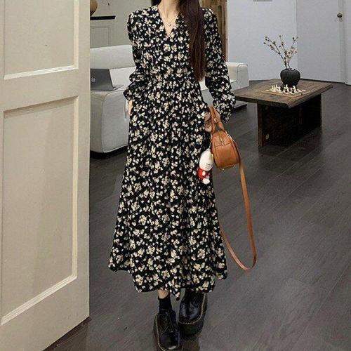 해피유통 여성 봄 가을 긴팔 단추 브이넥 프린트 패션 심플 엘레강스 원피스 jhJZ