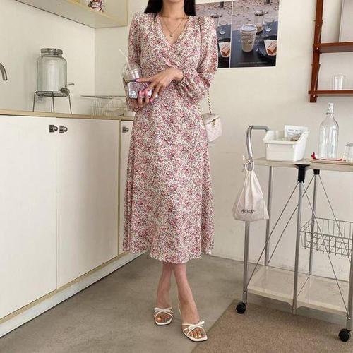 [옷자락] 여성 키치 스타일 플라워 패턴 루즈핏 뷔스티에 롱 드레스