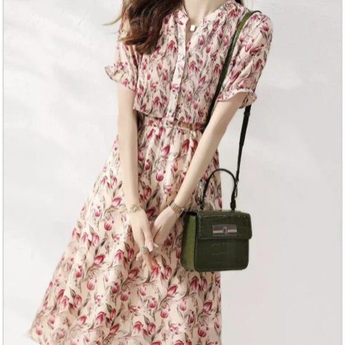 여성 빅사이즈 플라워 작은 브이넥 여름 반팔 쉬폰 원피스
