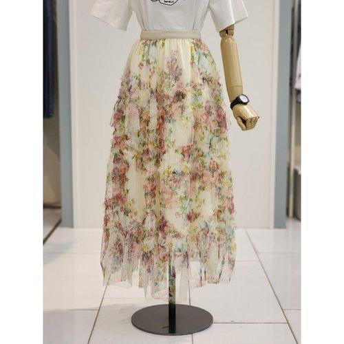 여름 수채화 플라워 프린팅 패턴 빅사이즈 레이스 캉캉 맥시 롱 스커트 미시 캐주얼