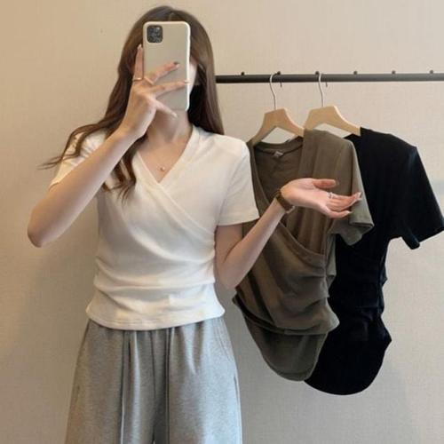 [라일리여성의류] Rly 여성 모던 무문양 티탑 V넥 플리츠면소재 모달