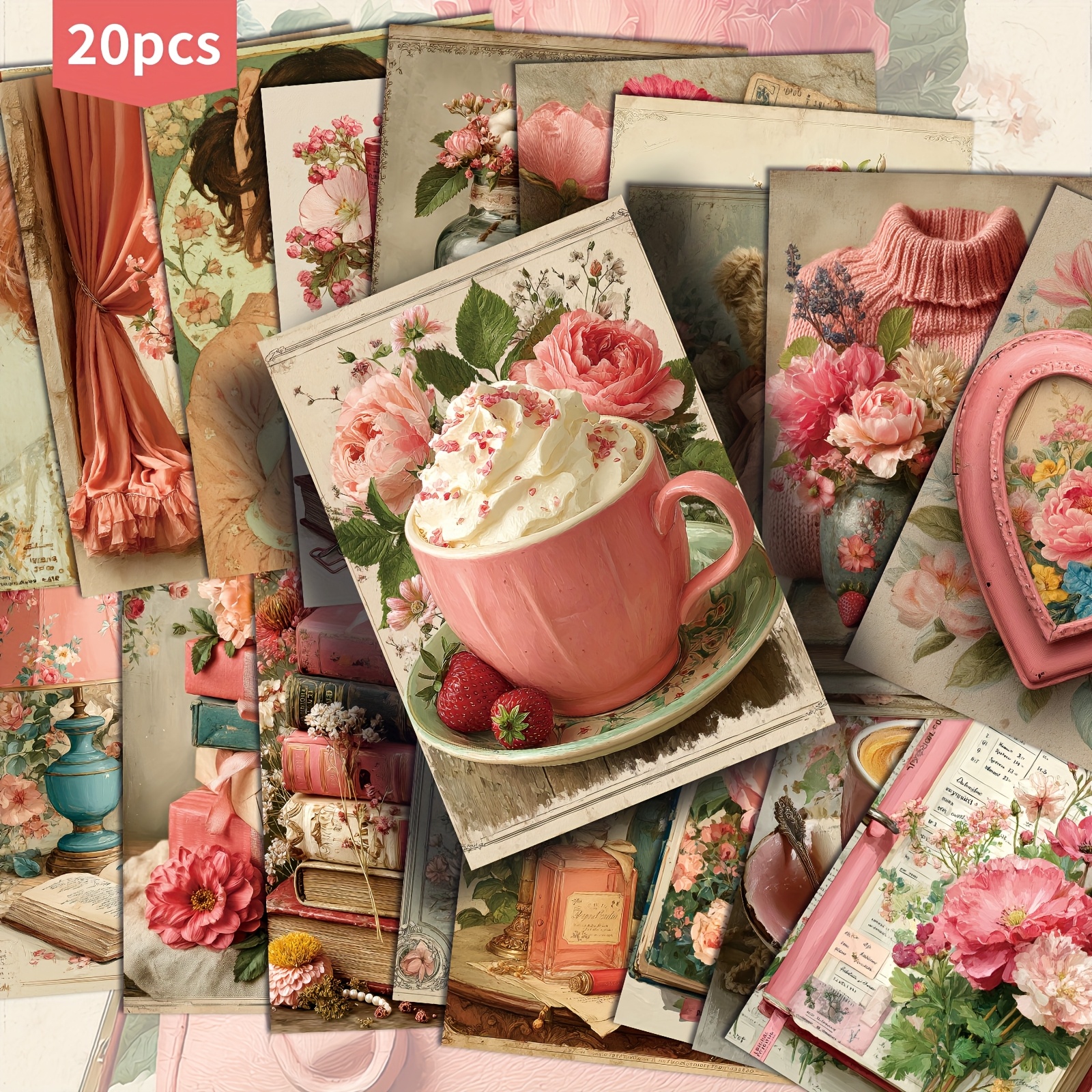 TEMU 레트로 스타일 핑크 플로럴 엽서 20매 세트 (4X6인치). 클래식 핀업 아트가 특징이며 스크랩북 및 공예에 적합합니다.