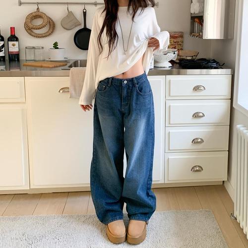 [옷자락]여자 밴딩 와이드핏 피치기모 데님 팬츠