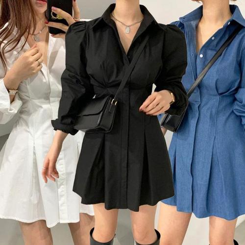 [굿쇼핑몰_의류]여성 입체 핀턱 볼륨 셔츠형 긴팔 미니 주름 원피스