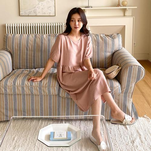 [옷자락]여성 심플 핀턱 셔링 라운드넥 미디 반팔 원피스