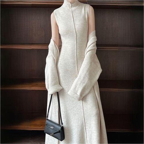 [오너클랜]인기상품 여성 슬림핏 반목 민소매 니트 롱원피스 롱가디건 세트 3색 [WFKQEK0_260413]