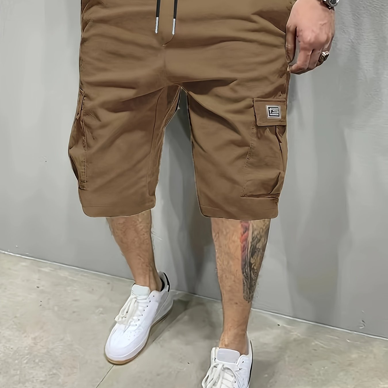 TEMU 남성 캐주얼 카고 반바지 - 갈색, 드로스트링 허리, 여러 포켓, 하이킹 및 야외 활동에 이상적, 야외 캐주얼 의류|카고 포켓 반바지| 편안한 핏