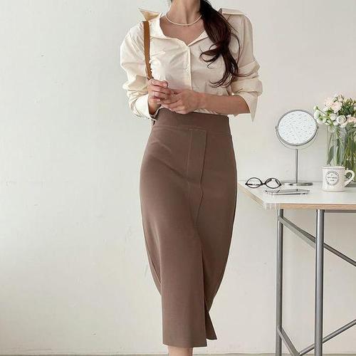 [하프클럽/]여성용 가을 하객 패션 H라인 앞트임 신축성 좋은 롱스커트