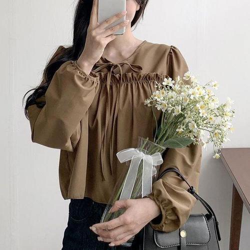 [옷자락]여성 가을 하객 패션 퍼프 소매 셔링 루즈핏 리본 블라우스