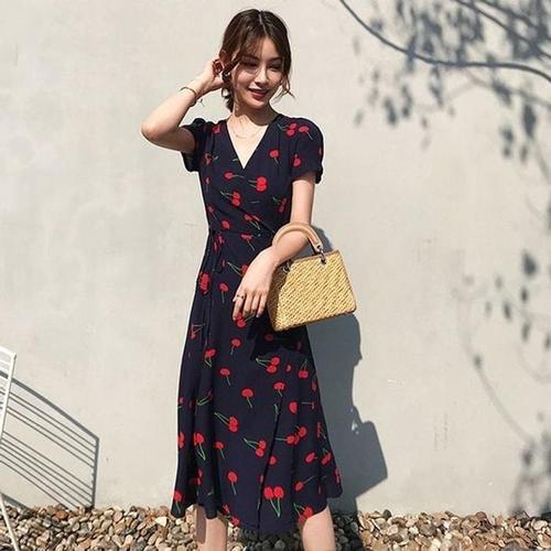 [라일리여성의류] Rly 롱라인 롱드레스 체리 브이칼라바캉스 하객 올데이