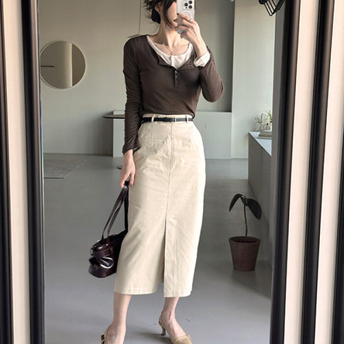 더클립 / 모노 벨트 하이웨스트 코튼 롱스커트 H라인스커트