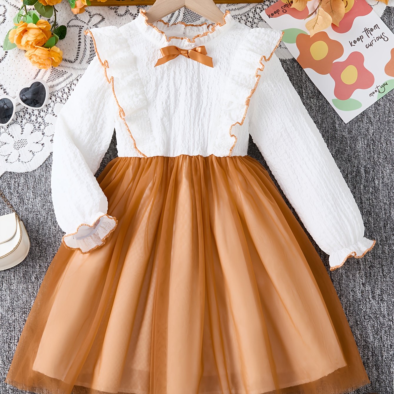 TEMU 소녀용 드레스 플러터 소매 & 리본 디테일 - 더블 레이어 튈 스커트, 긴 소매, 화이트 & 오렌지, 봄/가을에 완벽한 귀여운 & 우아한 디자인, 소녀를 위한 공주 드레스, 장식 리본 디테일, 부드러운 원단 가운|가을원피스