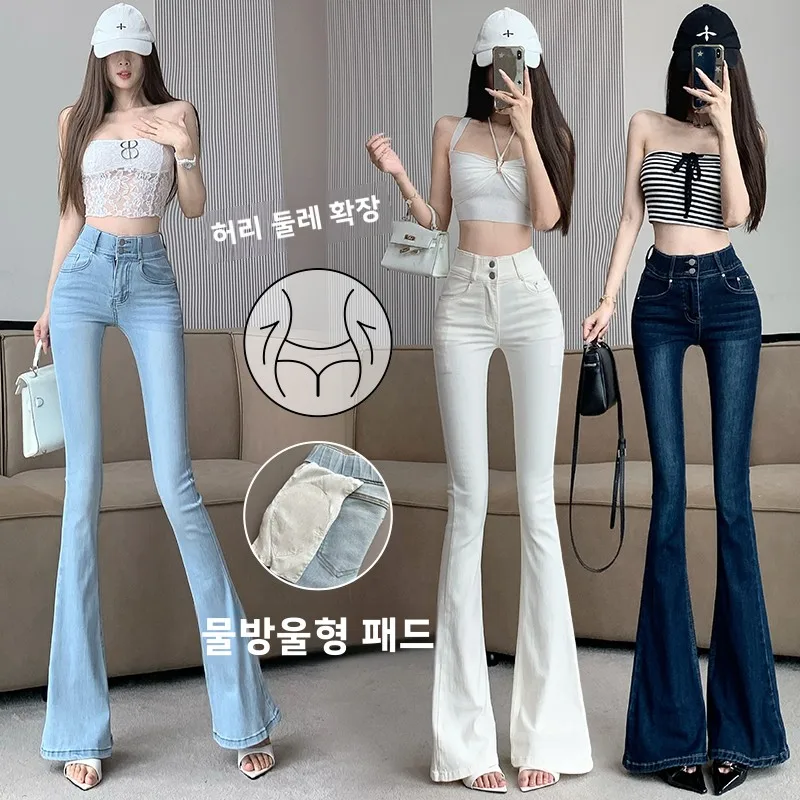 하이웨이스트 벨바텀 청바지 여성 여름 패션 신축성 있는 한국 스타일 다용도 롱 청바지 풍만한 힙 패드 포함