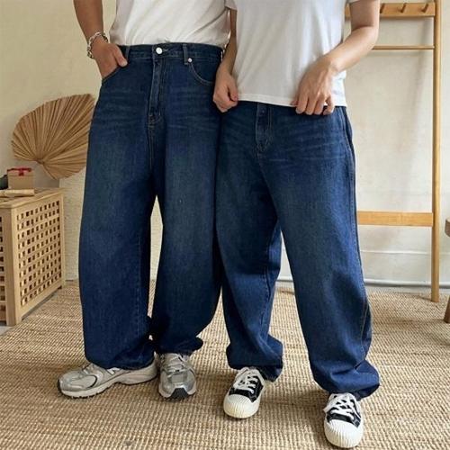 [옷자락]남자 여자 커브드 와이드 코튼 항아리핏 진청 청바지