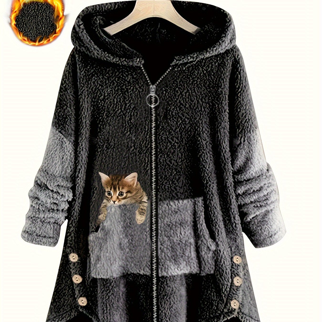 TEMU 여성용 플러스 사이즈 캐주얼 후드티, 고양이 프린트 - 포근한 플리스 안감 지퍼업 재킷, 긴 소매, 포켓 | 가을 & 겨울에 완벽함