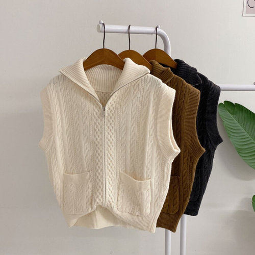 허니제이 / 슈카츠 카라 하이넥 꽈배기 니트 집업 조끼(3color)