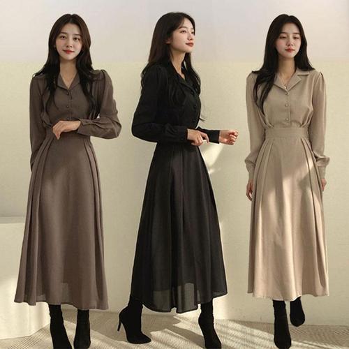 [신상오픈런]여성 A라인 롱 원피스 집업 시보리 허리 조절 가능 클래식 드레스