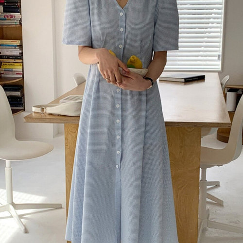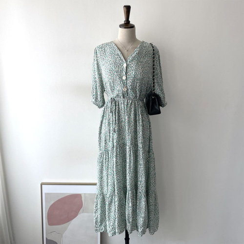 보니제이 / 퍼프소매 허리라인 V넥 반소매 롱원피스 미니단추 체