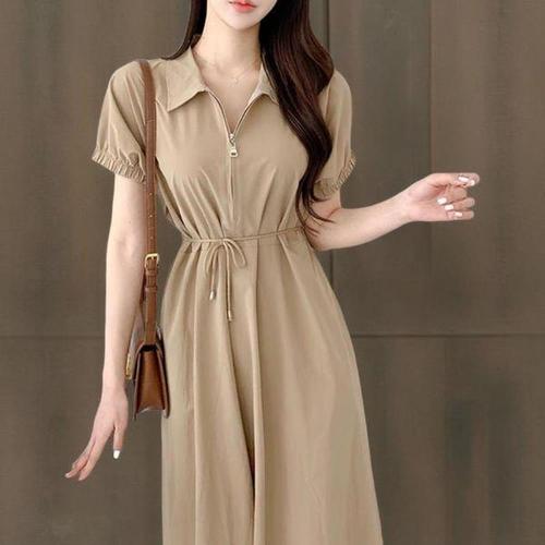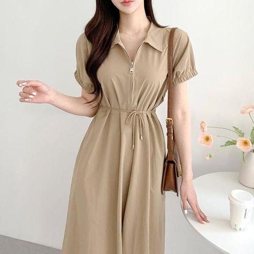 에르디테 / 여름 오피스 허리 밴딩 카라넥 롱 A라인 원피스 3컬러