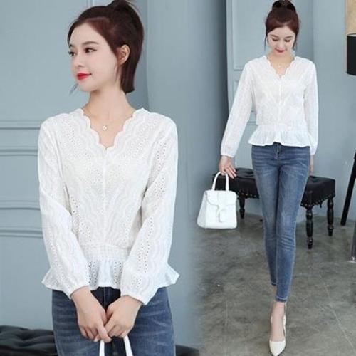 [엄지척]F7904/예쁨주의/허리셔링 펀칭레이스 V넥 블라우스/BL_19643169_667501