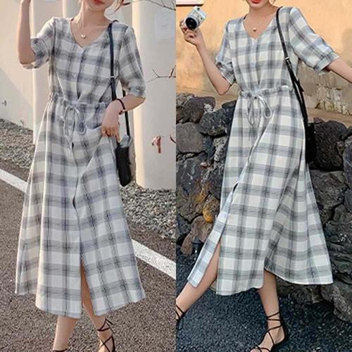 [모노무드]모노무드 여름 체크패턴 반팔 셔츠 원피스 허리스트링 브이넥