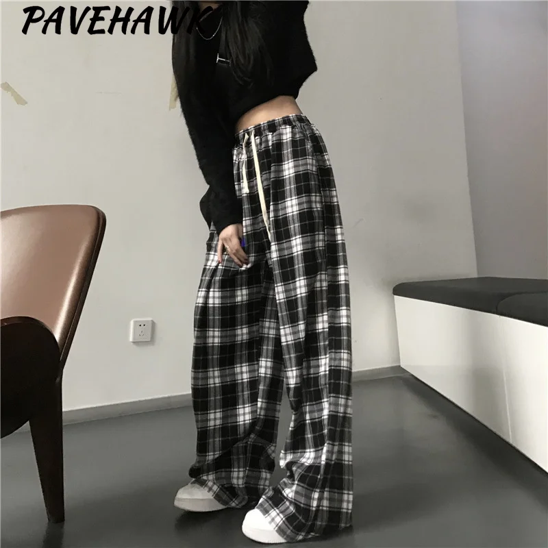 여성용 블랙 격자 무늬 와이드 레그 팬츠, 캐주얼 힙합 탄성 허리 포켓, 헐렁한 바지, 루즈 빈티지 Y2K 스웻팬츠 스트리트웨어