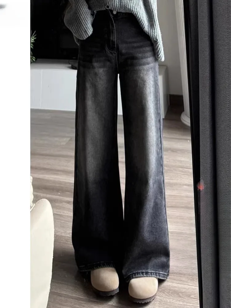플러스 사이즈 하이웨이스트 플리스 안감 와이드 레그 진 여성용 루즈 스트레이트 롱 팬츠 가을 겨울 캐주얼 스타일