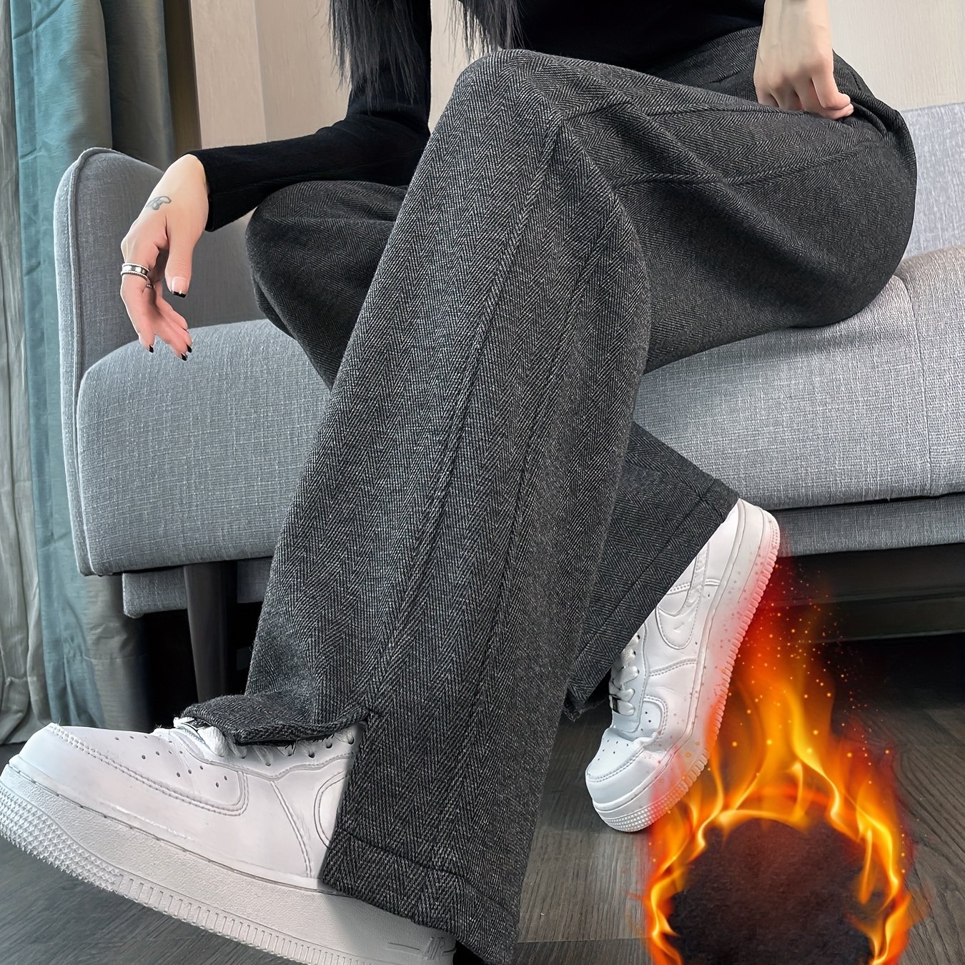 TEMU 여성용 두꺼운 기모 안감 하이웨이스트 와이드 레그 트라우저 - 겨울 따뜻함, 탄성 허리 & 포켓, 단색 캐주얼 바지 (가을/겨울용), /중성 톤, 세탁기 사용 가능