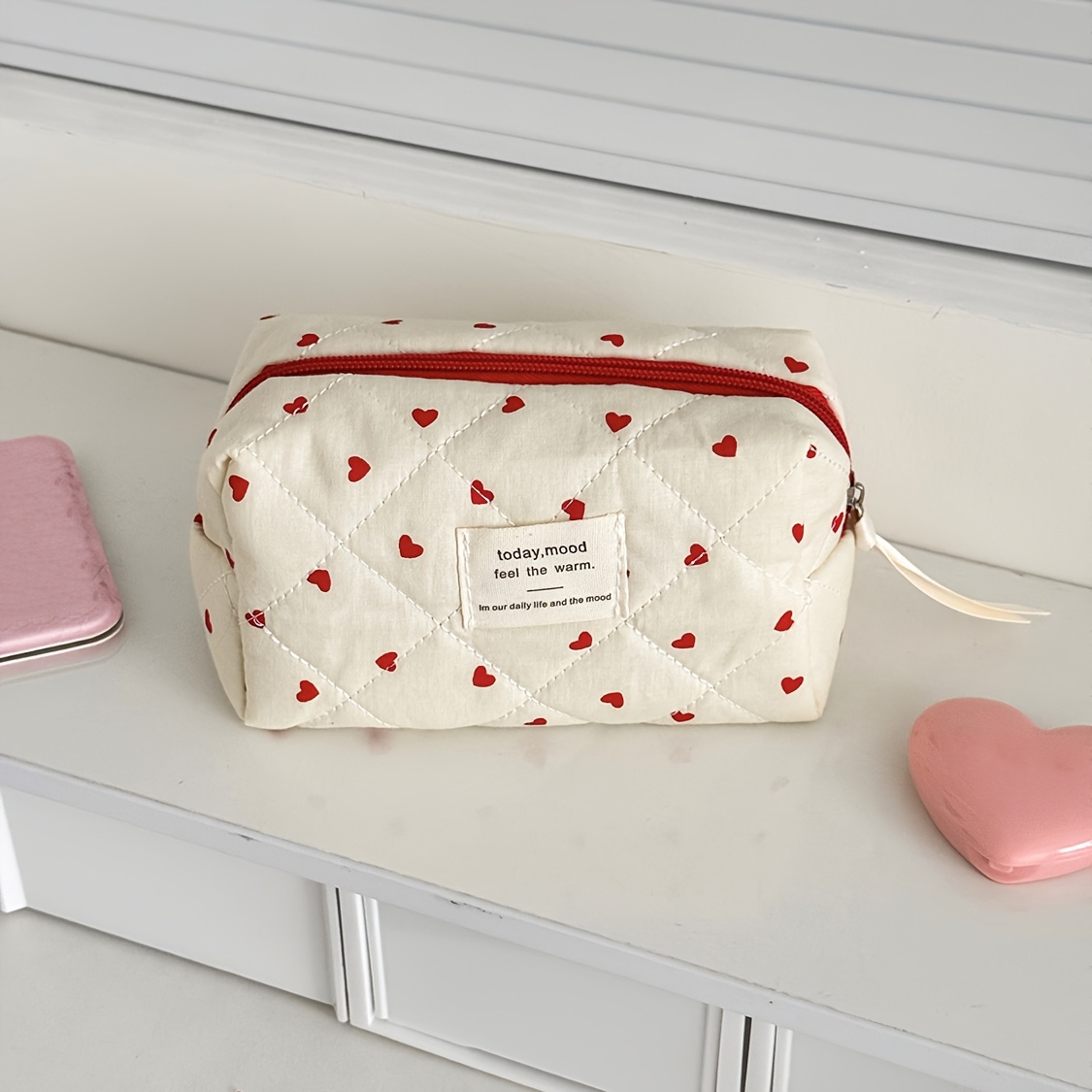 TEMU 여아용 부드러운 자수 하트 모양 화장품 가방, 대용량, 휴대용 여행용 세면도구 가방 (화장품 보관용)