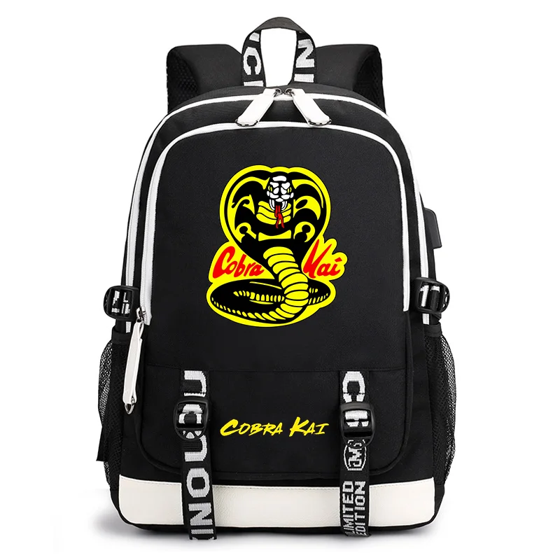 새로운 패션 코브라 카이 인쇄 대용량 배낭 청소년 야외 USB 배낭 학교 학교 가방 성취 배낭