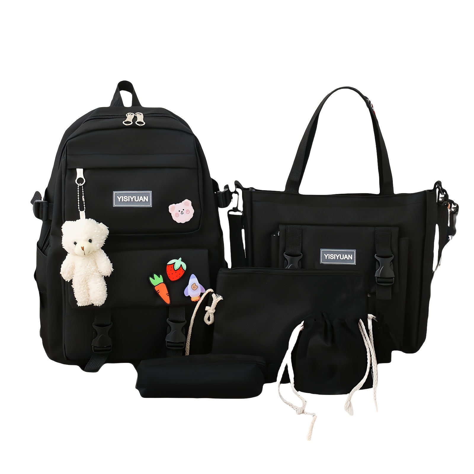 TEMU 새로운 패션 컬러블록 멀티 기능 학교 백팩 세트, 가볍고 대용량 캠퍼스 백팩 (랜덤 디자인) 곰 펜던트 뱃지 포함|백팩