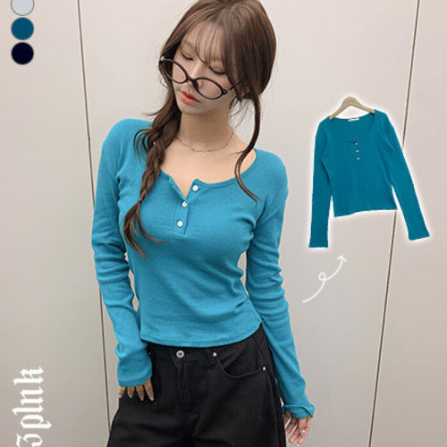 더핑크 / 데지 슬림핏 도트 펀칭 헨리넥 버튼 긴팔티