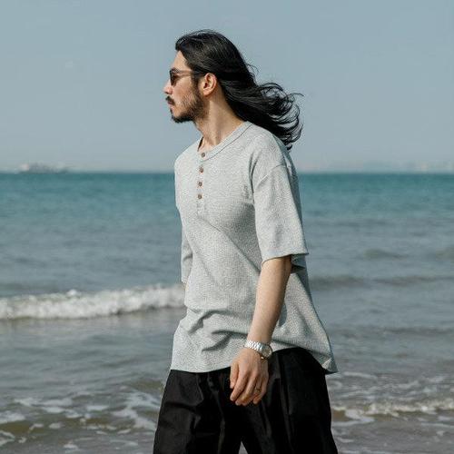 [러기드하우스]러기드하우스 레트로 헨리넥 와플 반팔티 멜란지그레이