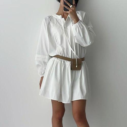 [옷자락] 여자 타이 헨리넥 퍼프 핀턱 플레어 가을 미니원피스