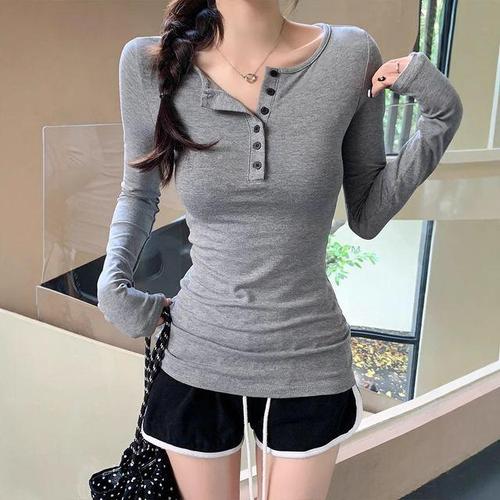 [모노무드]LMO 슬림 골패턴 롱슬리브티 레이디스 데일리 헨리넥스트레치 심플 티