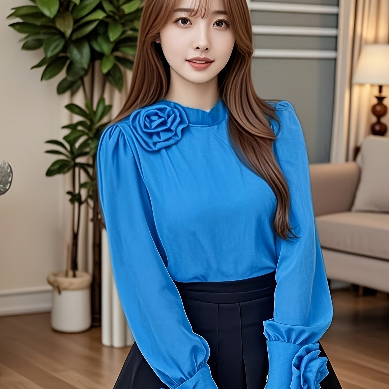 TEMU 3D 플로럴 데코 셔츠 - 봄/가을 스탠드 칼라 버블 소매 블라우스, 부드러운 롱슬리브 탑