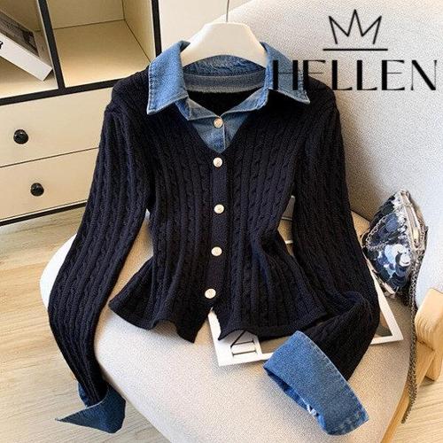 [헬렌]헬렌 유니크 카라넥 데님 레이어드 배색 브이넥 니트