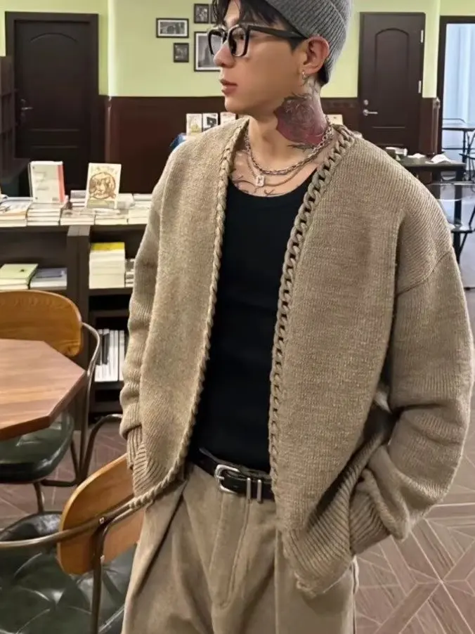 미국 레트로 니트 체인 스웨터 남성 캐주얼 카키색 가을 겨울 오픈 가디건 아우터웨어 루즈핏 긴팔 브이넥