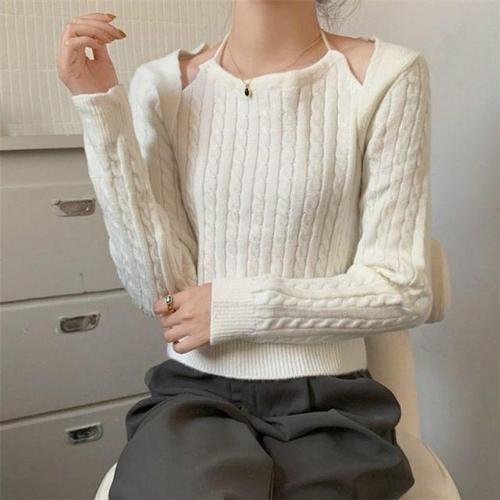 [옷자락]여자 로프숄더 홀터넥 크롭 니트 티셔츠