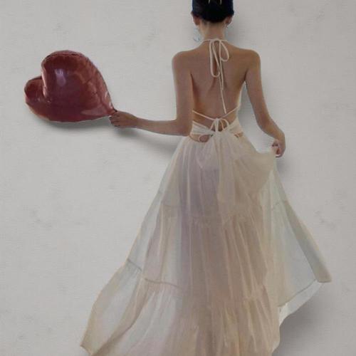 [옷자락]여성 백리스 홀터넥 리본 스트랩 여름 원피스