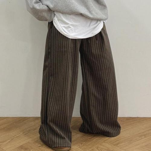 LINHAOO 옆라인 스트라이프 와이드 팬츠 | 여성용 봄가을 캐주얼 트레이닝 바지 레이스 디테일 루즈핏 롱팬츠