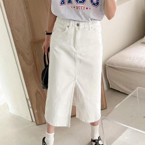 [미라클세븐][M7] 여자 슬릿 진 자수 에이라인 흰치마 롱스커트