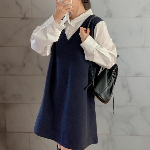[옷자락]여성 하객룩 레이어드 화이트 셔츠 브이넥 루즈핏 미디 원피스