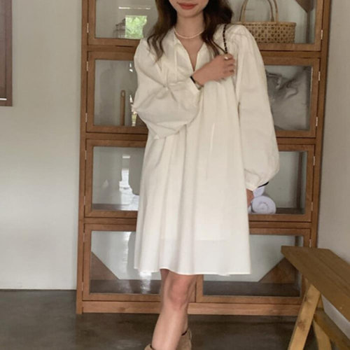 [다잇템_패션]여자 벌룬소매 중간 흰색 잔주름 여유핏 원피스