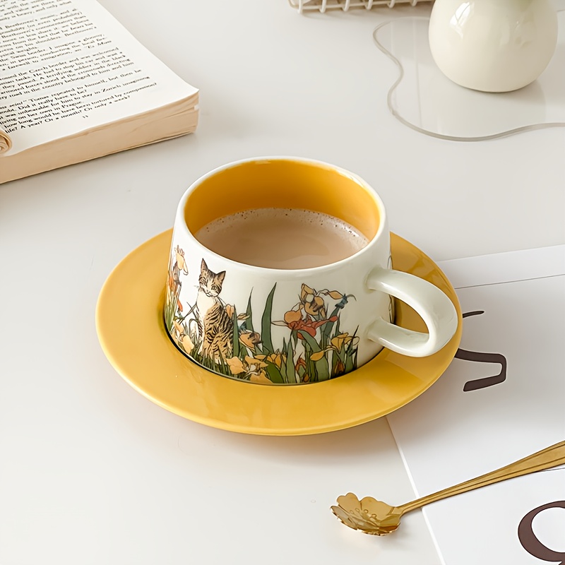 TEMU 우아한 고양이 & 나비 세라믹 커피 머그 & 접시 세트 - 옐로우 & 브라운 동물 프린트, 손세척 전용, 오후 티, 라떼 또는 일상 사용에 적합, 예쁜컵, 도자기컵, 커피컵, 커피잔세트, 티컵, 커피 머그 세트, 다기세트