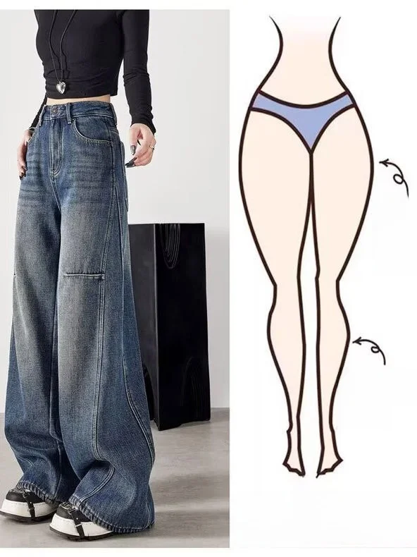 하이웨이스트 와이드 레그 진 여성용 레이지 스타일 다용도 슬리밍 롱 트렌디 INS 나이프 엣지 포켓 데님 팬츠