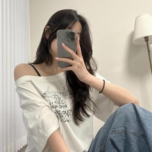 [다잇템][다잇템] 여자 볼드숄더 반소매 필기체 입술넥 캐쥬얼 티셔츠_22958785_588872
