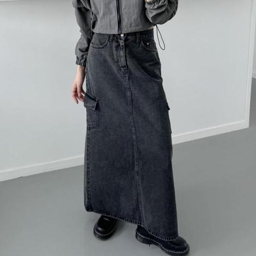 [다잇템]여자 흑청 카고치마 뒤트임 스트릿 롱스커트