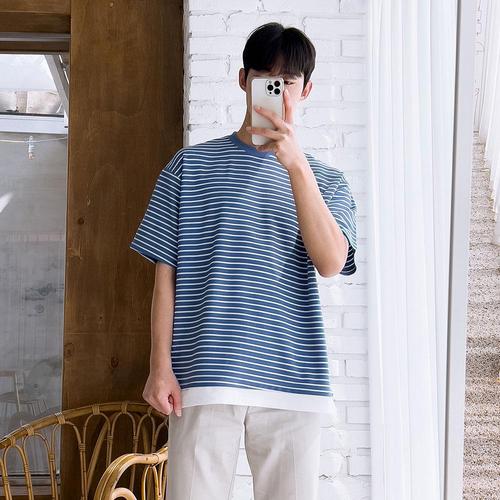 1+1 남자 링클프리 스트라이프 레이어드 반팔티셔츠 5C-TSH-Q014